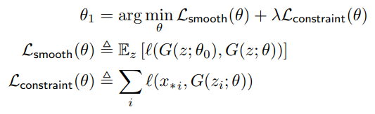 생성기 연산 G(z; θ)를 특정 레이어 L에 대해 L-1 레이어의 출력을 k로 하고 해당 레이어의 가중치를 W0로 하여 단일 레이어 연산 f(k; W0)로 바꾼다. 그러면 최종 출력 x*i에 근사하는 문제를 해당 레이어의 출력 v*i에 근사하는 문제로 변경할 수 있다.
