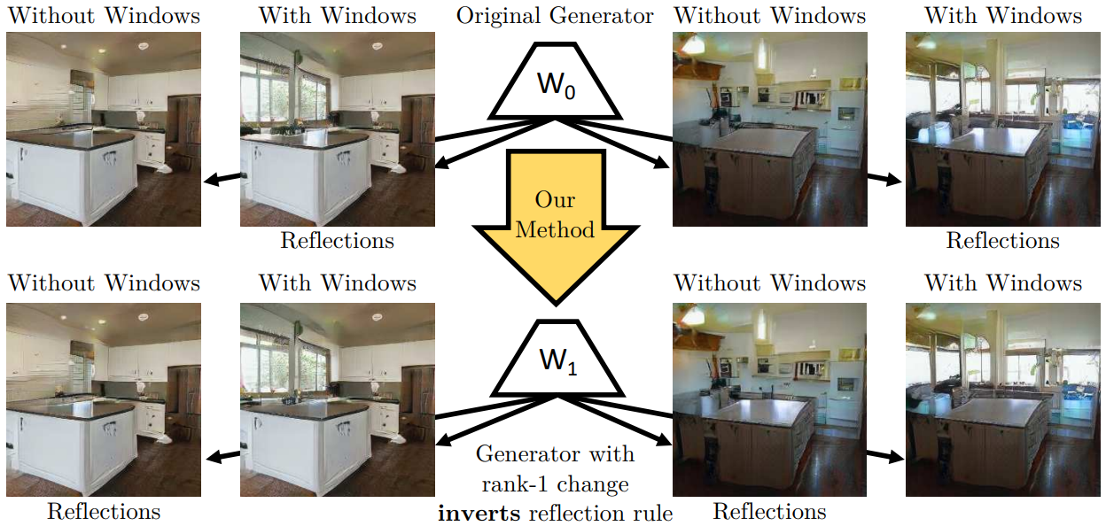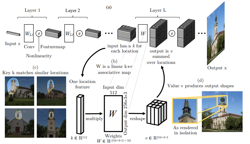 모델 내에서 특정한 의미 관계를 찾고 변경하기 위해 선형 연관 메모리의 개념을 심층 생성기의 비선형 컨볼루션 레이어로 일반화하는 방법을 보여준다. 각 레이어는 숨겨진 feature에 대한 키-값 관계 세트로 잠재 규칙을 저장한다.