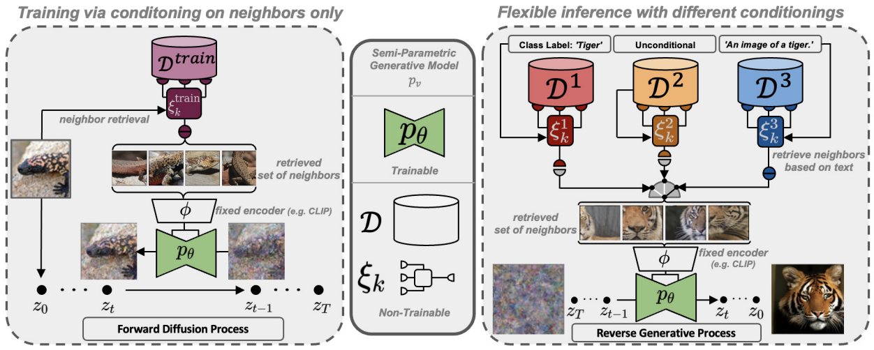 자연어 처리에서의 성공적인 적용에 영감을 받아 검색 기반 접근 방식으로 확산 모델을 보완하고 외부 데이터베이스 형태의 명시적 메모리를 도입할 것을 제안한다. 본 논문의 확산 모델은 CLIP을 통해 각 훈련 인스턴스의 이웃에서 검색된 유사한 시각적 특징으로 훈련된다. 또한 적은 계산 및 메모리 오버헤드를 발생시키고 구현하기 쉽다.