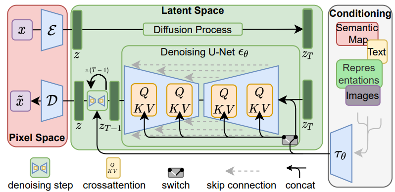 품질과 유연성을 유지하면서 제한된 계산 리소스에 대한 확산 모델 훈련을 가능하게 하기 위해 사전 훈련된 autoencoder 사용 + cross attention을 도입한 latent diffusion models (LDMs) 제안.