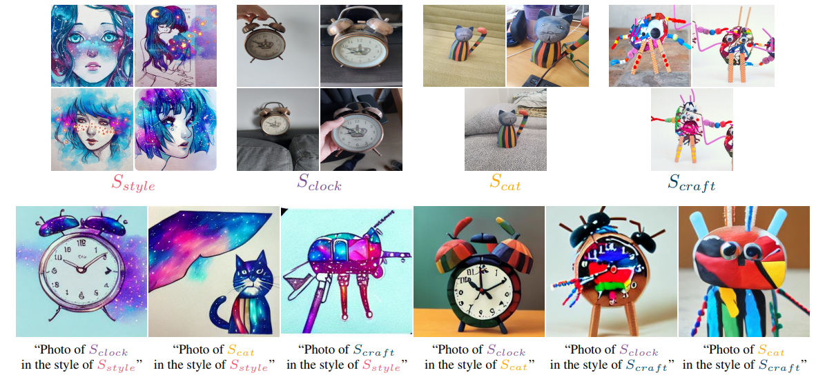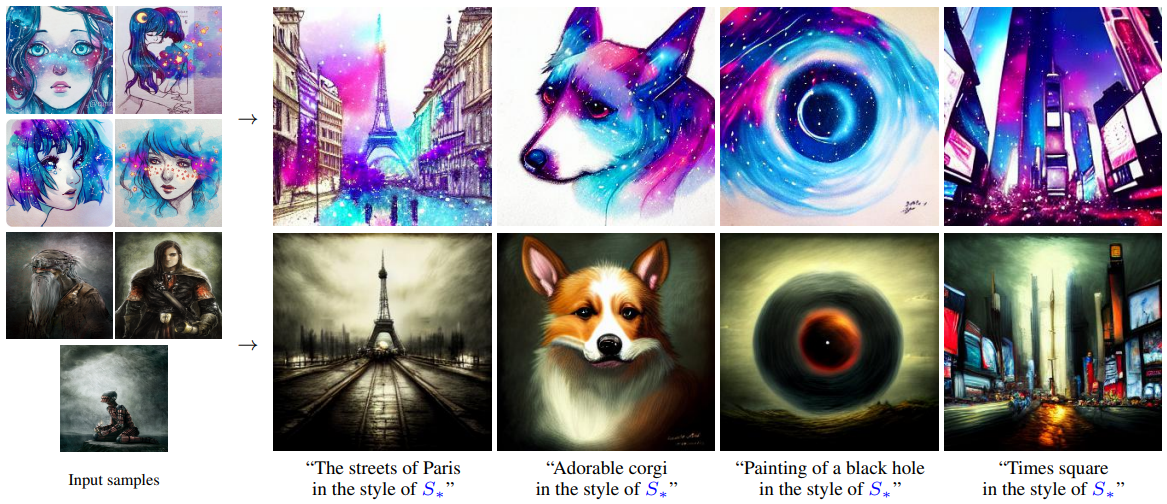 훈련 단계에서 context text를 “A painting in the style of S∗”와 같은 형식으로 대체하여 스타일 전송 작업 또한 가능하다.