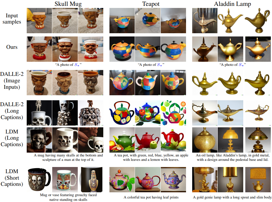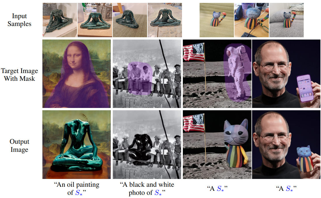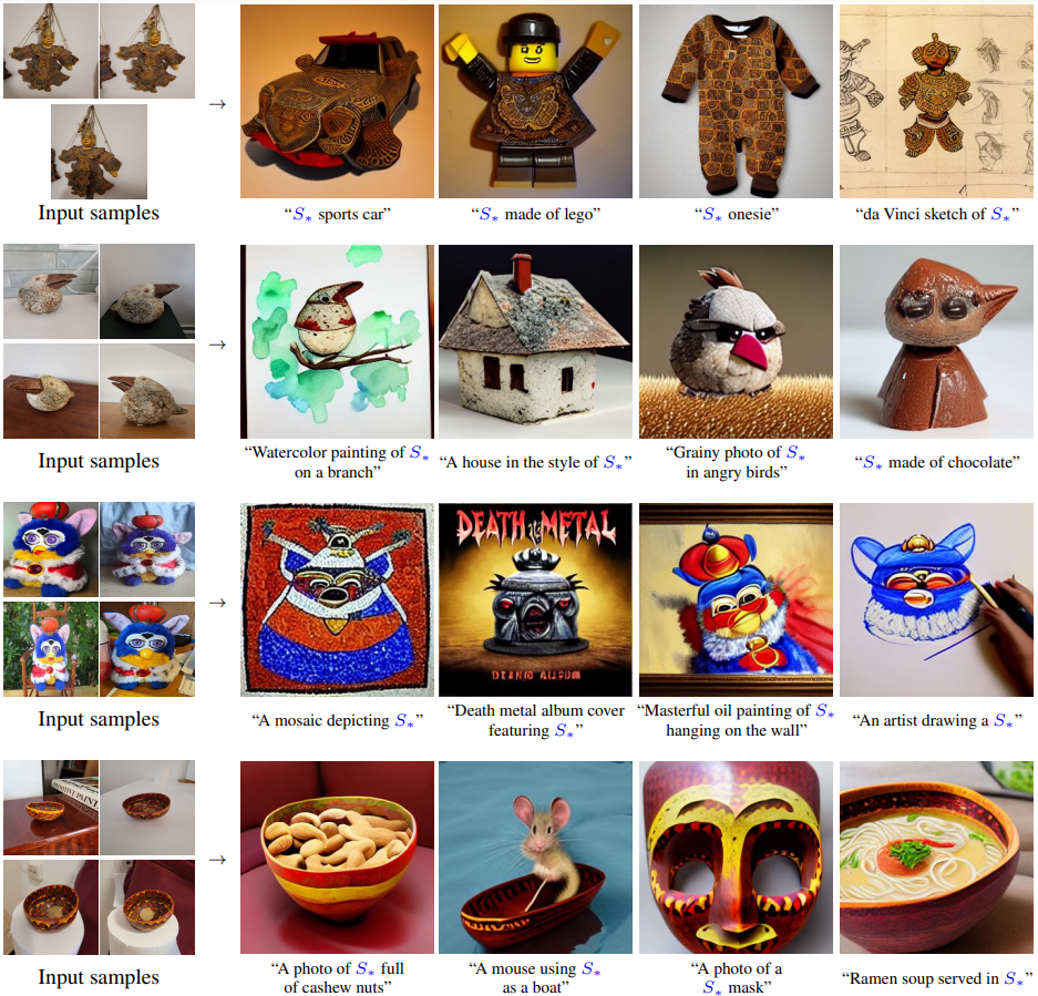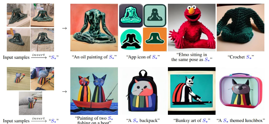 Text-to-image 모델이 어떻게 이미지를 생성, 구성하는지 불분명하다. 본 논문에서는 창조적 자유를 허용하는 간단한 접근 방식을 제시한다. 3~5개의 이미지만을 이용하여 임베딩 공간에서 새로운 "words"를 통해 표현하는 방법을 배운다.
