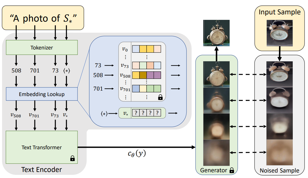 사전 훈련된 text-to-image 모델의 텍스트 임베딩 공간에서 새로운 word를 찾아 이러한 문제를 극복할 것을 제안한다. 새로운 pseudo-word를 S*로 표시하고 생성모델을 변경하지 않은 채로 S*를 다른 일반적인 words처럼 처리한다.