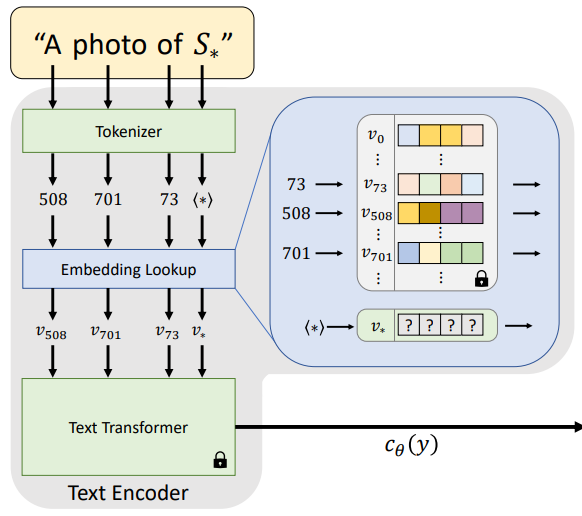 BERT와 같은 일반적인 텍스트 인코더 모델은 아래 그림과 같이 토큰화와 고유 벡터에 임베딩하는 과정을 거친다. 이 임베딩 공간을 반전 대상으로 선택하고 S*와 관련된 벡터를 v*로 교체한다.