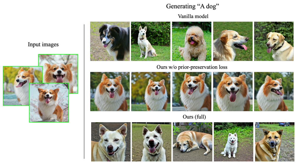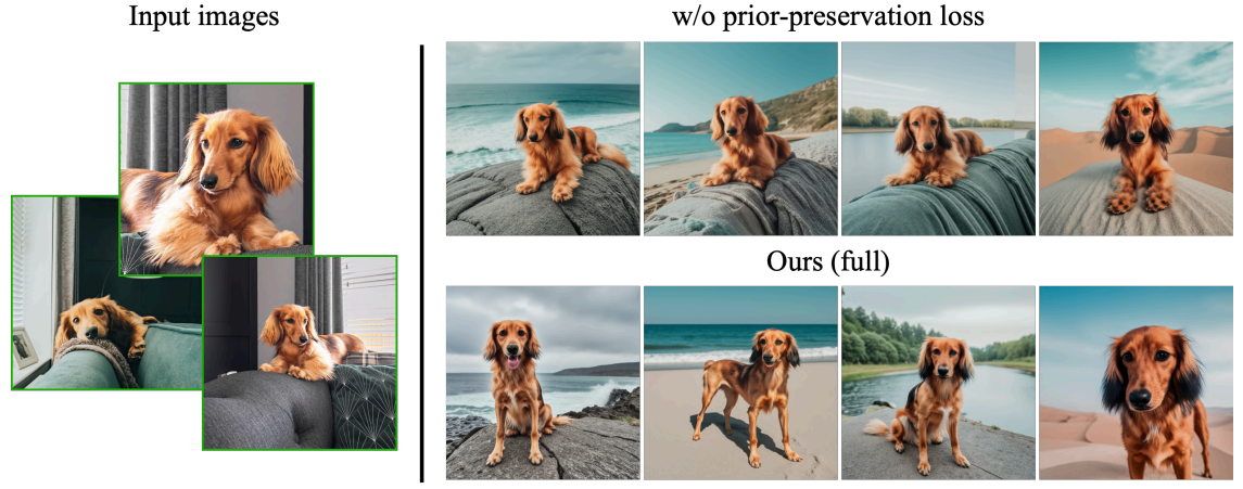 적은 이미지를 이용한 finetuning은 과적합 되기 쉽기 때문에 이를 방지하기 위해 autogenous class-specific prior preservation loss 제안.