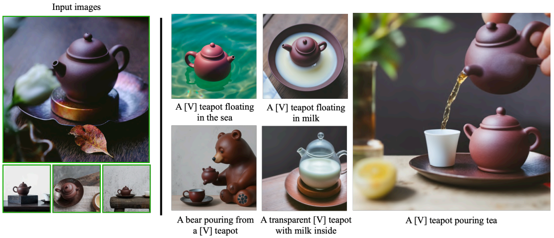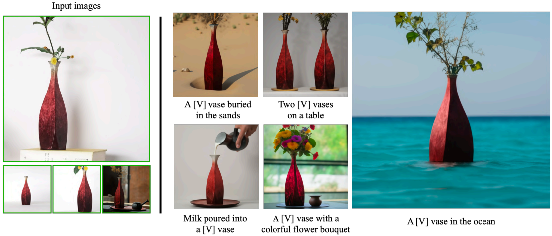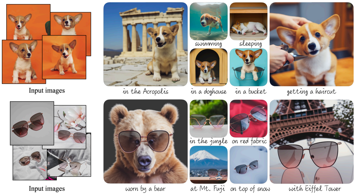 이미지 몇 개만 입력하면 사전 훈련된 text-to-image 모델을 finetuning 하여 고유 식별자를 해당 특정 대상에 바인딩하는 방법을 학습한다. 고유 식별자를 사용하여 다른 장면에서 맥락화 된 대상의 완전히 새로운 사실적 이미지를 합성할 수 있다.