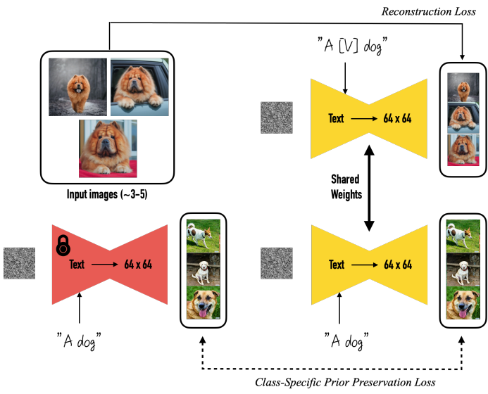 먼저 고유 식별자와 클래스 이름이 포함된 이미지 및 텍스트 프롬프트(e.g., “A [V] dog”)를 사용하여 저해상도에서 finetuning한다. 여기서 모델이 클래스 이름(e.g., “dog”)을 특정 인스턴스와 연관시키는 것을 방지하기 위해 autogenous class-specific prior preservation loss를 제안하는데, 이는 모델에 포함된 클래스에 앞서 대상과 동일한 클래스의 다양한 인스턴스를 생성하도록 권장한다.