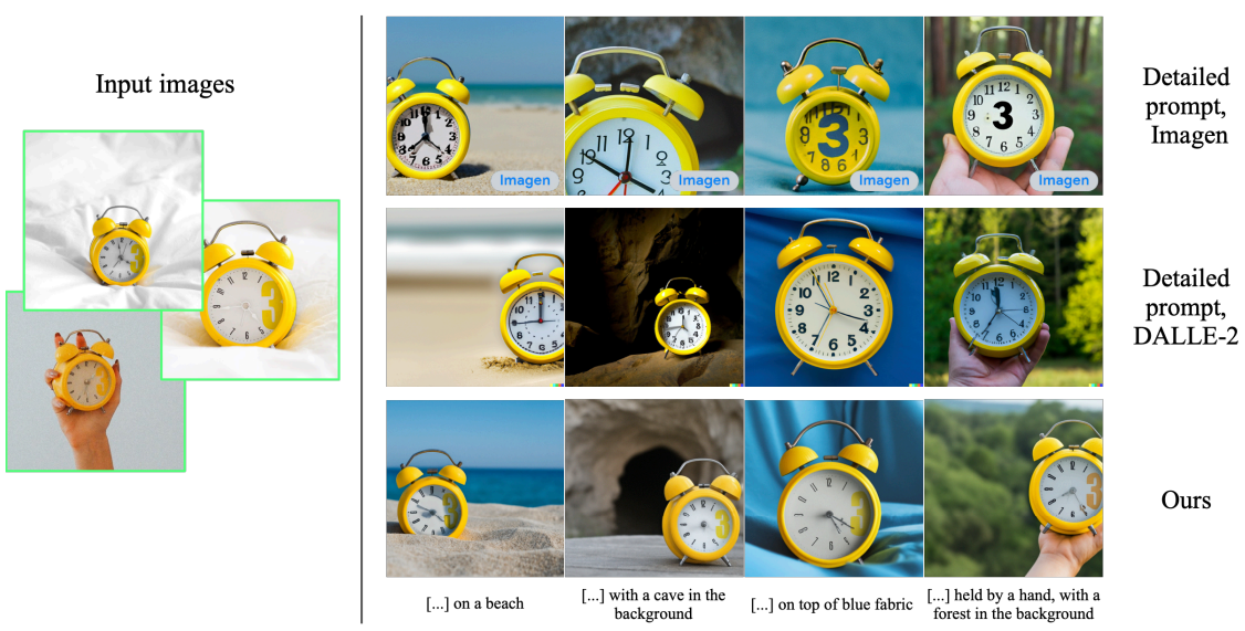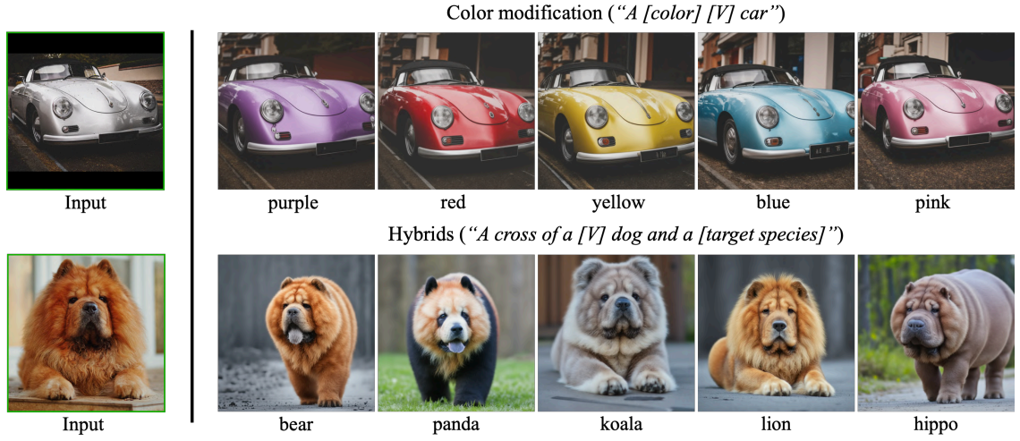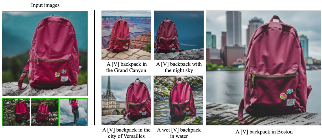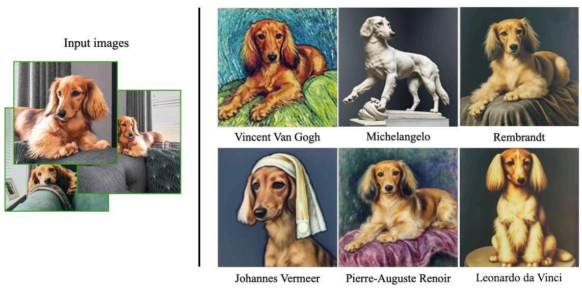 이미지 몇 개만 입력하면 사전 훈련된 text-to-image 모델을 finetuning 하여 고유 식별자를 해당 특정 대상에 바인딩하는 방법을 학습한다. 고유 식별자를 사용하여 다른 장면에서 맥락화 된 대상의 완전히 새로운 사실적 이미지를 합성할 수 있다.
