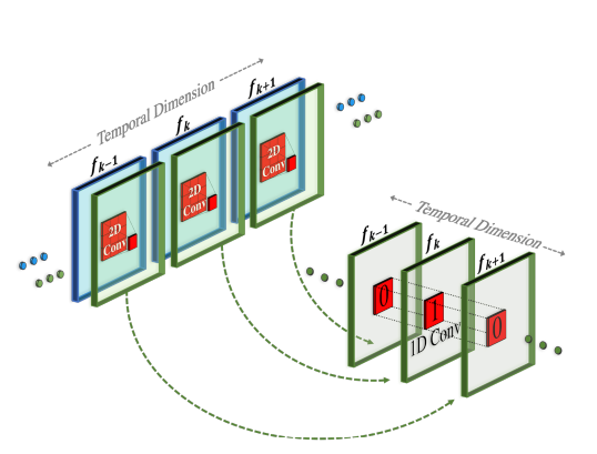 3D 변환의 무거운 계산 부하를 피하기 위해 separable convolution에서 영감을 받아 2D 컨볼루션 이후 1D 컨볼루션을 쌓고 시간-공간 정보 공유를 원활하게 한다. 또한 미리 훈련된 2D conv 레이어와 새로 초기화된 1D conv 레이어 사이에 구체적인 파티션을 만들어 공간 컨볼루션 가중치에서 이전에 학습한 공간 지식을 유지하면서 시간 컨볼루션을 처음부터 훈련할 수 있다. (2D 컨볼루션도 얼리지 않고 훈련은 같이 함.)