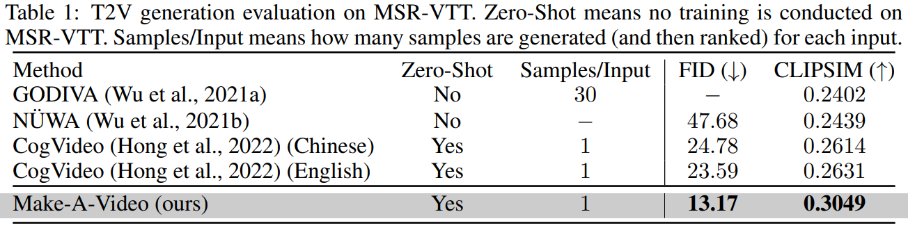 - Make-A-Video : 확산 기반 T2I 모델을 시공간 인수분해 확산 모델을 통해 T2V로 확장하는 효과적인 방법을 제시한다.
