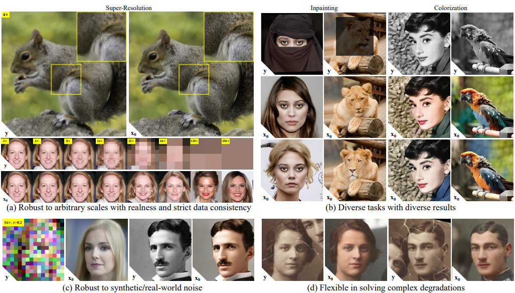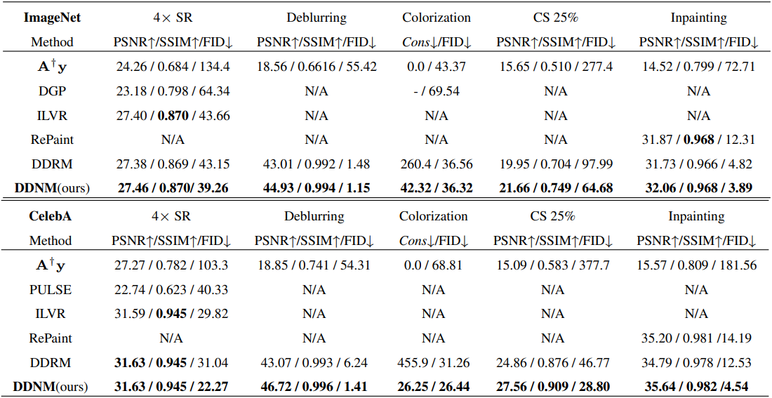 DDNM은 최적화 또는 네트워크의 수정없이 역확산 과정에서 null-space 콘텐츠의 정제 만으로 현실적이고 일관성 있는 결과를 산출할 수 있다고 한다. 또한 super-resolution, colorization, compressed sensing, inpainting, deblurring 등 다양한 작업에서 최첨단 성능을 보여줌.