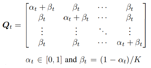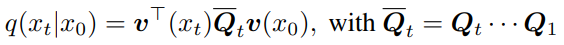 더 자세히, 이미지 x0의 한 이미지 토큰 x0i에 대해 K x K markov transition matrix Qt를 활용하여 다음 단계에 어떤 토큰으로 바뀔지에 대한 확률을 정의할 수 있다.