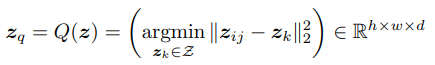 이미지 x가 주어지면 공간 feature zij를 가까운 코드북 항목 zk에 매핑하는 quantizer Q(·)와 컬렉션 zq를 얻는다.