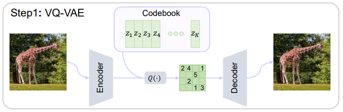 VQ-VAE는 인코더 E, 디코더 G, 코드북 Z(i ∈ {1, 2, ..., K})로 구성된다.