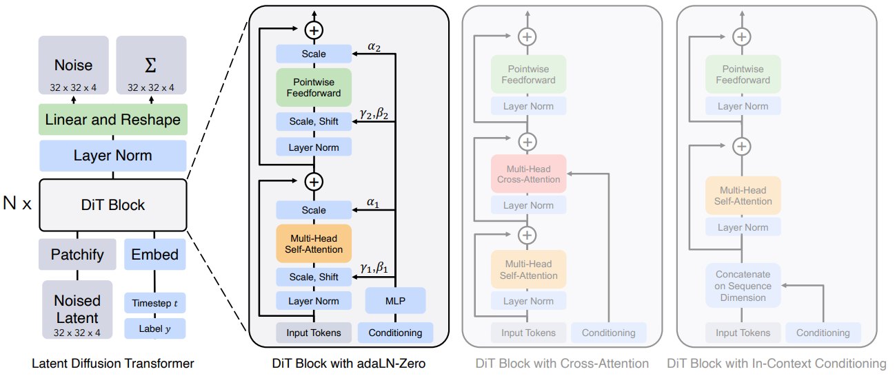 In-context conditioning : t와 c의 벡터 임베딩을 일반 토큰으로 추가 (맨 오른쪽)