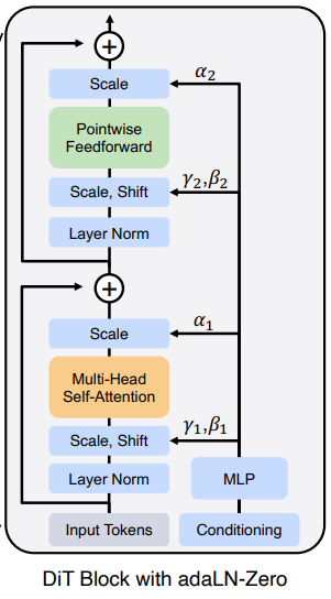 확산 모델의 U-Net에서 잔차 연결 직전 각 블록의 최종 컨볼루션 레이어를 0으로 초기화한다. 이는 잔차 블록을 ID로 만들고 훈련을 가속화하는 데 효과가 있다. DiT 블록에서 똑같이 함. 또한 잔차 연결 직전 적응형 스케일링 매개변수 α 추가.