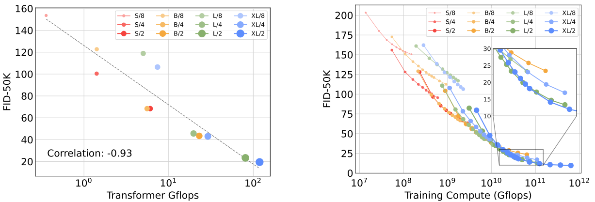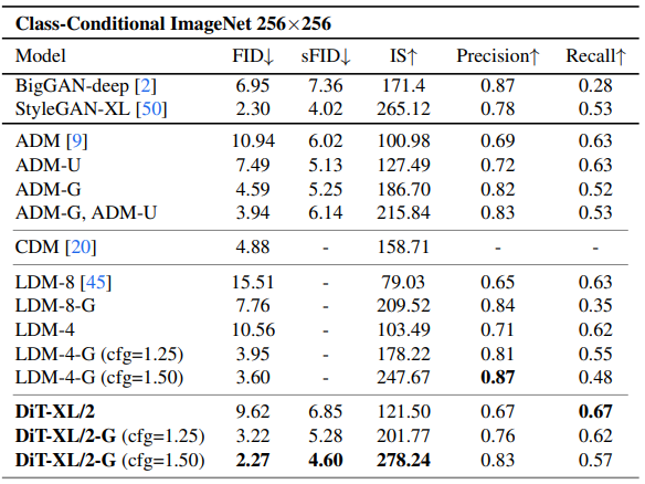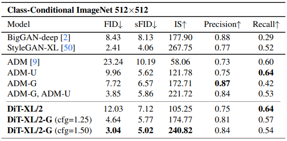 트랜스포머의 깊이/폭 증가 또는 입력 토큰의 증가가 더 낮은 FID를 갖는다는 것을 발견하였으며 class-conditional ImageNet 512, 256에서 이전의 모든 확산 모델을 능가한 2.27 FID를 달성하였다.