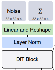 각 토큰을 p x p x 2C 형태로 디코딩하고 최종 예측 노이즈와 공분산을 얻기 위해 재배열.