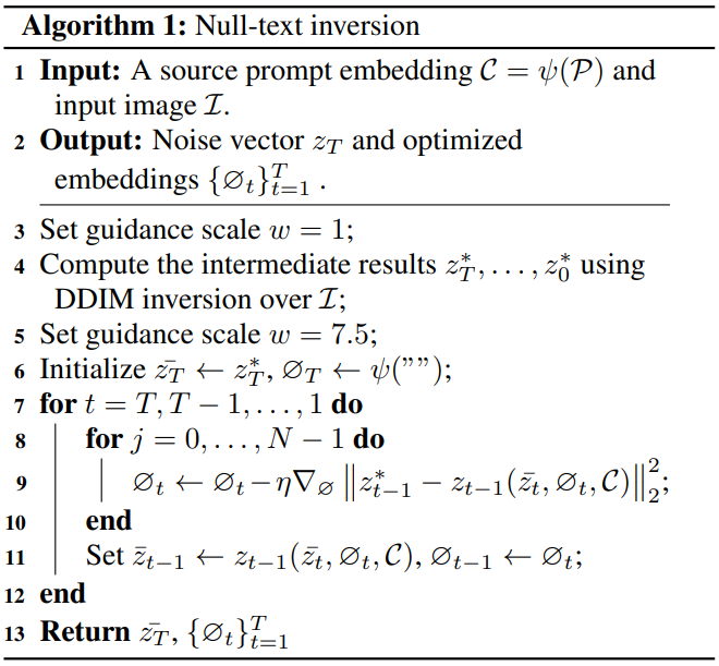 - 입력 텍스트 임베딩이 아닌 classifier-free guidance에서 사용하는 무조건 텍스트 임베딩만 수정하는 null-text 최적화