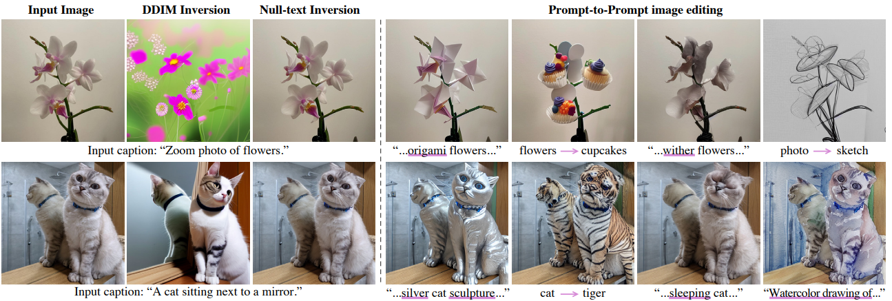 Prompt-to-prompt와 무조건 임베딩 최적화를 이용하면 고품질 재구성과 높은 편집성을 달성할 수 있지만, 당연히 모델을 미세 조정하는 것보다는 표현력이 낮기 때문에 효율적인 반전 체계가 필요하다.