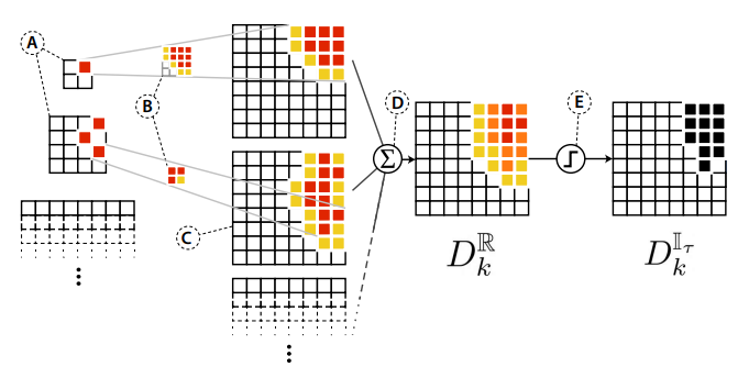 Ft(i)↓[x,y,l,k]는 k번째 단어를 i번째 다운샘플링 블록과 l번째 head에 대한 중간 좌표 (x,y)에 연결하고 [0,1]로 정규화된다.