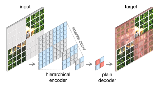 3D point cloud를 처리하는 데 쓰이는 sparse convolution에 영감을 받아, 마스킹된 입력을 희소 패치 세트로 취급하고 희소 컨볼루션으로 처리한다.