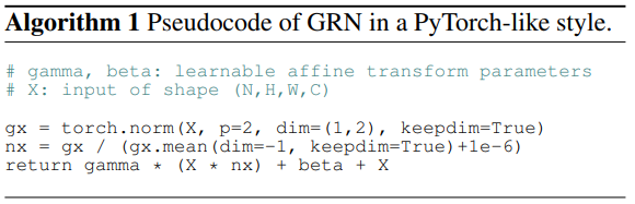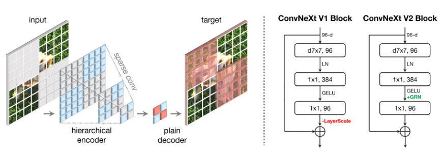 본 논문에서는 ConNeXt 아키텍처에 fully convolutional masked autoencoder framework를 도입하고 채널 간 feature competition을 강화하기 위해 Global Response Normalization (GRN) layer를 추가한다.