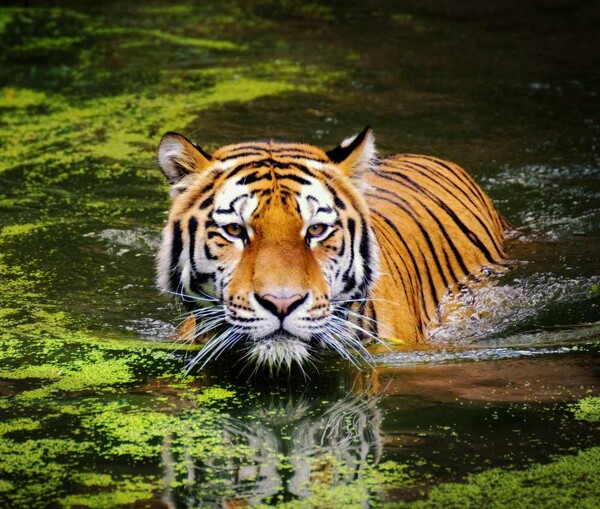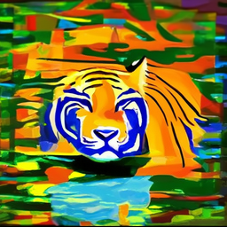 Prompt : A paint of a tiger half submerged in water in cubism style.