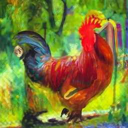 Prompt : An oil painting of a rooster in impressionism style.