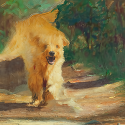 Prompt : An oil painting of a dog in impressionism style.