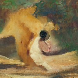 Prompt : An oil painting of a dog in impressionism style.