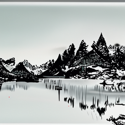 Prompt : A small village between a lake and snow-covered mountains, expressed in ink and wash.