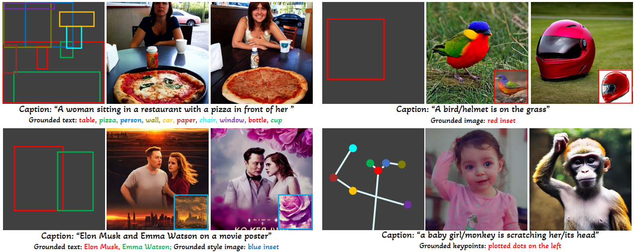 모델이 잘 학습된 뒤에는 사용자 마음대로 caption에 존재하는 단어를 grounding 하거나, caption에 언급하지 않고도 자유롭게 object를 추가할 수 있다.