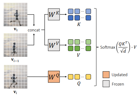 SC-attention은 프레임 vi에서 이전 프레임으로의 단방향 매핑이고, 이전 프레임에서 파생된 key와 value는 vi의 출력에 독립적이기 때문에 Wk, Wv는 고정하고 Wq만 업데이트한다.