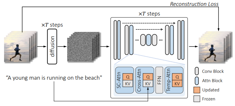 사전 훈련된 Text-to-Image(T2I) 확산 모델의 튜닝을 통해 text prompt에서 비디오를 생성하는 Sparse-Causal Attention이 있는 Tune-A-Video(TAV) 제안