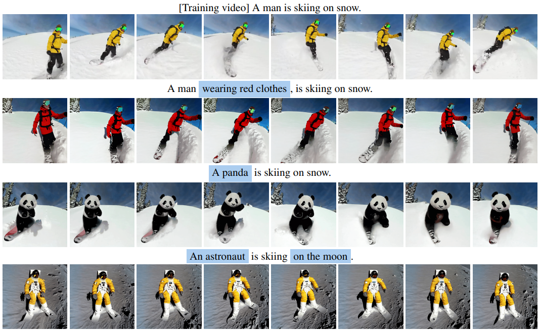 T와 같은 동사를 공유하는 text prompt T̂과 사전 훈련된 T2I 모델 M을 통해 새로운 비디오 V̂을 생성한다.