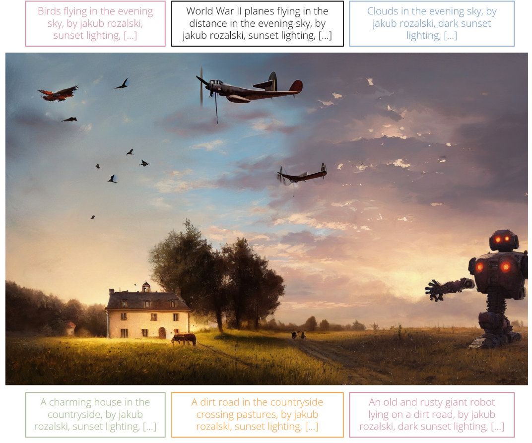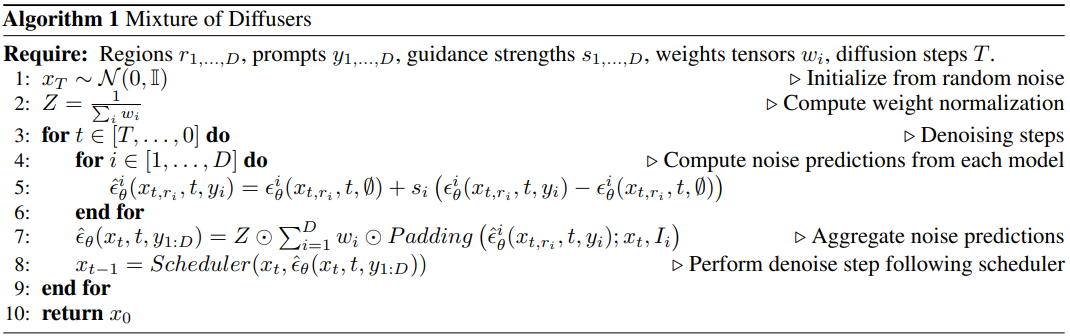 캔버스의 서로 다른 영역에 작용하는 여러 확산 과정을 조화시킴으로써 더 큰 이미지를 생성할 수 있는 Mixture of Diffusers 알고리즘 제안