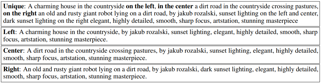 일반적인 확산 모델은 다음과 같은 프롬프트를 잘 나타내지 못하며, 위치가 무시된다.