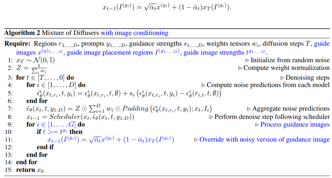 Mixture of Diffusers에서는 안내 영역 I(gi)를 추가하여 t시점에서 t > t(gi)일 경우 해당 영역의 이미지를 안내 이미지로 대체하는 컨디셔닝 방법 사용.
