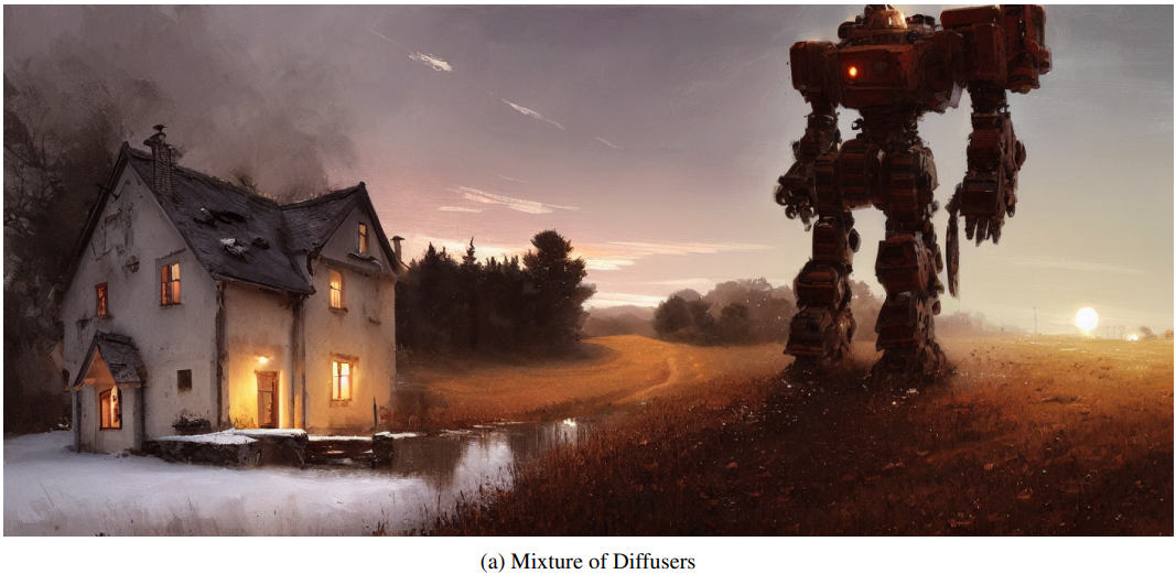 캔버스의 서로 다른 영역에 작용하는 여러 확산 과정을 조화시킴으로써 더 큰 이미지를 생성할 수 있는 Mixture of Diffusers 알고리즘 제안