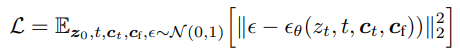 Noise image zt, 시간 단계 t, 조건 텍스트 ct, 사용자 입력 조건 cf에 확산 과정 최적화