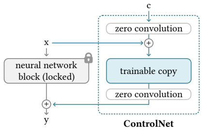 ControlNet에서는 사전 훈련된 대형 모델의 생성 품질을 보존하고 fine tuning의 과적합을 방지하기 위해 Θ를 둘로 나누고 trainable copy만 훈련한다.