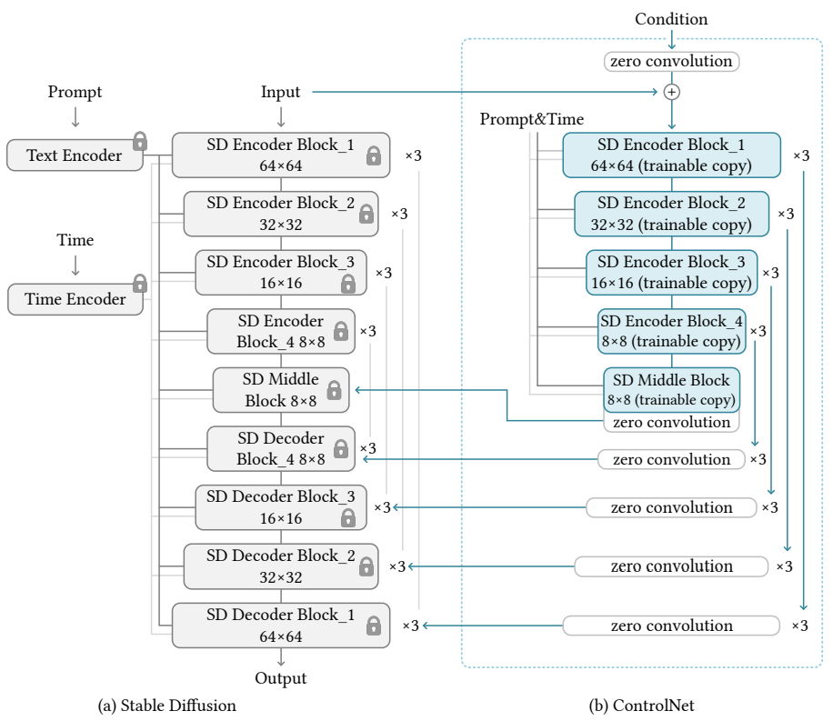 ControlNet은 확산 모델의 가중치를 trainable copy, locked copy로 복제하며 locked copy는 네트워크의 feature를 보존하고 trainable copy는 조건부 통제를 학습한다.