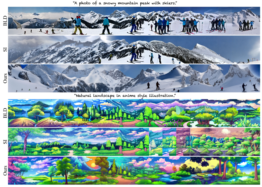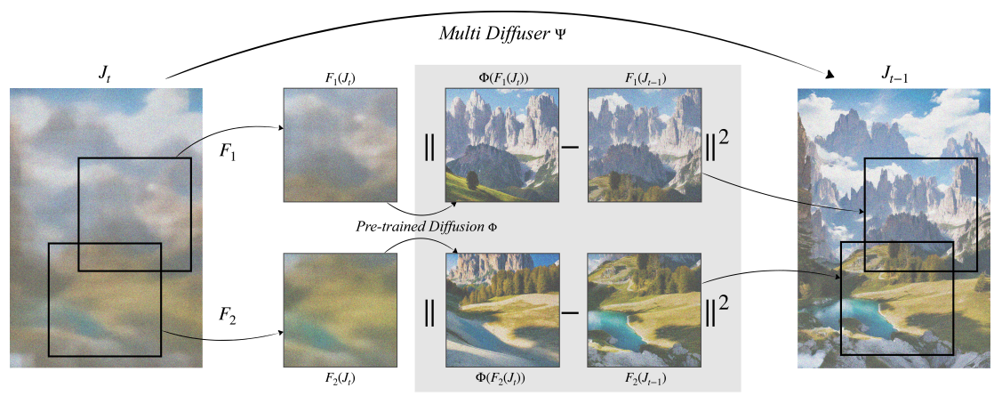 사전 훈련된 참조 확산 모델은 이미지의 서로 다른 영역에 적용되고 MultiDiffusion은 최소 제곱 최적화를 통해 global denoising sampling step을 수행한다.