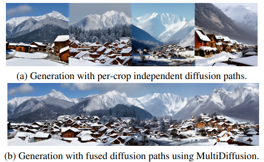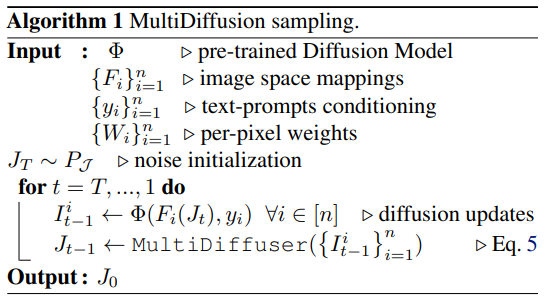 사전 훈련된 참조 확산 모델은 이미지의 서로 다른 영역에 적용되고 MultiDiffusion은 최소 제곱 최적화를 통해 global denoising sampling step을 수행한다.