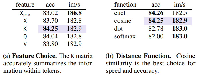 토큰 병합 전 '유사'의 의미를 정의해야 하는데, transformer의 중간 feature는 과도하게 매개변수화되기 때문에 단순히 feature 사이의 거리를 비교하는 것은 최적이 아니다.