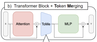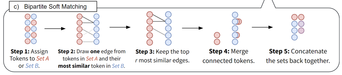 ToMe는 경량 매칭 알고리즘을 사용하여 유사한 토큰을 점진적으로 결합한다.