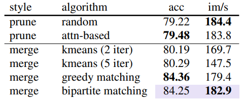 실제로 이 'bipartite soft matching'은 무작위 토큰을 드롭하는 것만큼이나 빠르고 코드 몇 줄만 추가하면 가능하다.