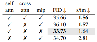 FID는 프롬프트 반영도를 고려하지 않기 때문에 self attn에만 적용했을 때 FID가 가장 좋다.