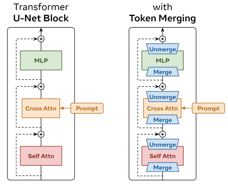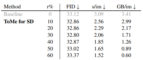 추가적인 훈련 없이 평가 속도를 높일 수 있는 token merging(ToMe)을 SD에 적용.
